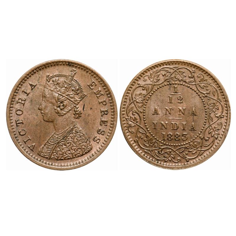 Victoria Empress, Copper, 1/12 Anna, 1883, Bombay Mint, Obv 'A', No mint mark. GK 895. Almost Uncirculated. Rare.