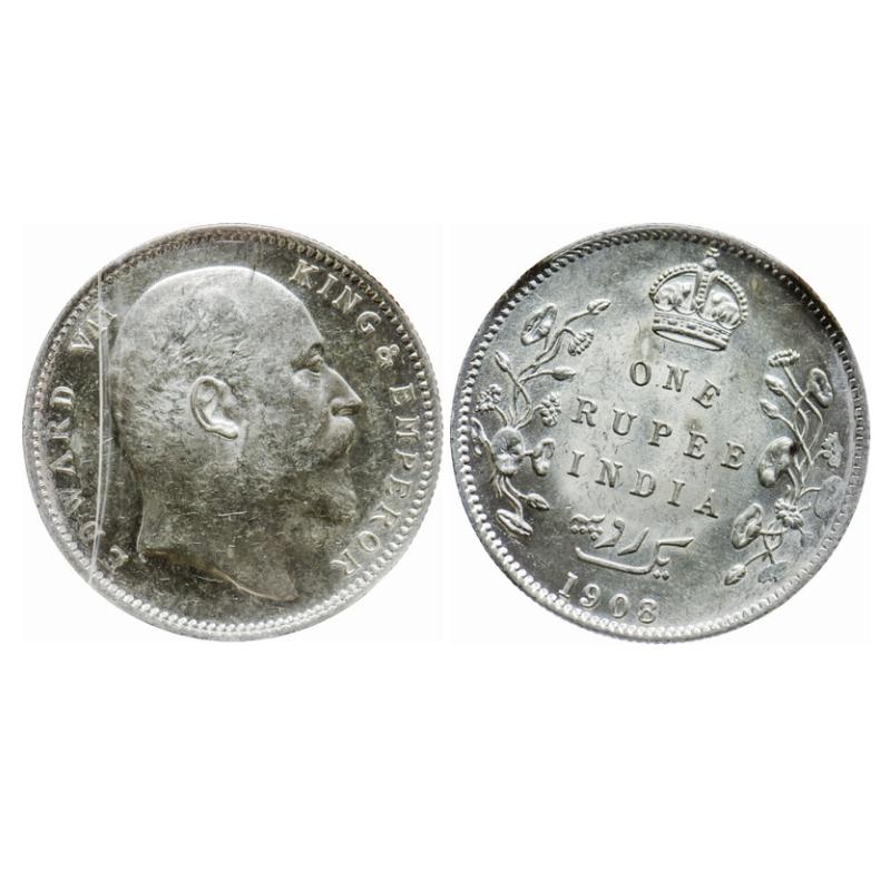 Edward VII, Silver, Rupee, 1908, Calcutta Mint, 'No mint mark, 1'o clock on rev. (The slab has a crack on obv image). GK 946. NGS Slabbed AU 58+. Rare.