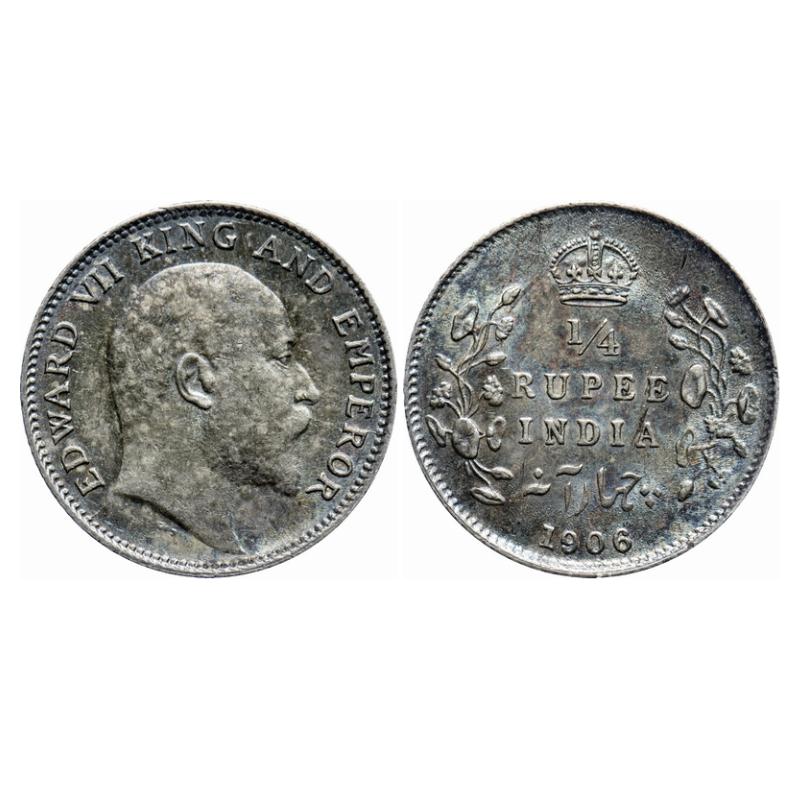 Edward VII, Silver, 1/4 Rupee, 1906, Calcutta Mint, No mint mark. GK 975. Uncirculated, Toned. Rare.