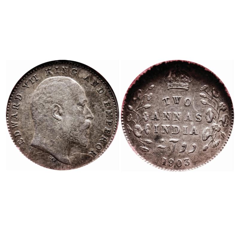 Edward VII, Silver, 2 Annas, 1903, Calcutta Mint, No mint mark. GK 980. NGS Slabbed. AMS 55. Very Scarce.