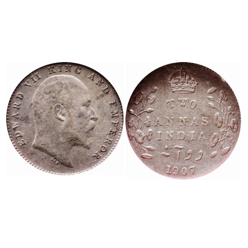 Edward VII, Silver, 2 Annas, 1907, Calcutta Mint, No mint mark. GK 984. NGS Slabbed. AMS 58. Rare,