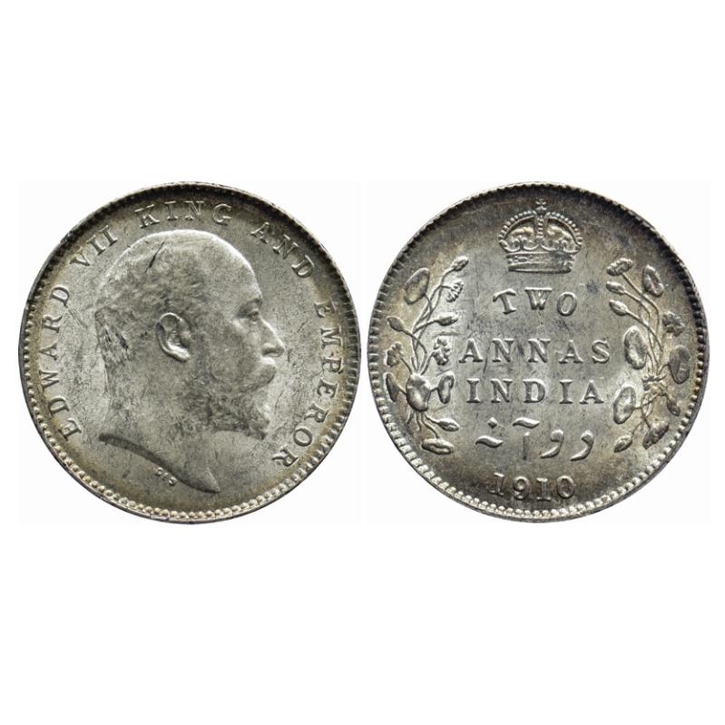 Edward VII, Silver, 2 Anna, 1910, Calcutta Mint, No mint mark. GK 987. Uncirculated. Rare.
