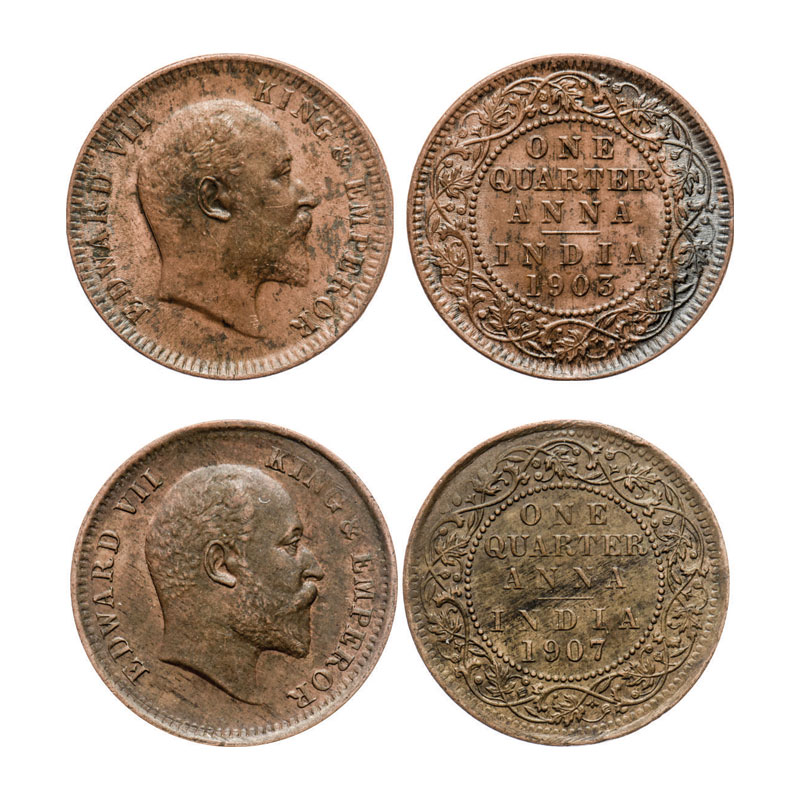 | Edward VII, Mix Metal, Quarter Anna (2 coins), 1903, Copper, Calcutta Mint, No mint mark, 1907, Bronze, Calcutta Mint, No mint mark. GK 994, 999. Very Fine+ to Extremely Fine. Scarce. |