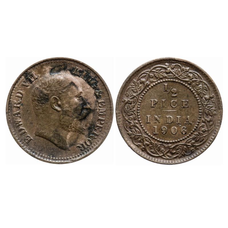 Edward VII, Bronze, 2.36gm, 1/2 Pice, 1906, Calcutta Mint, No mint mark, Ghost on rev. GK 1007. Very Fine+. Very Scarce.