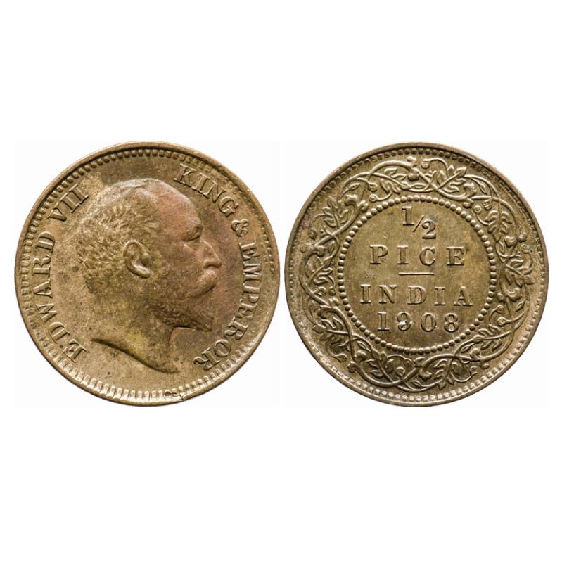 Edward VII, Bronze, 1/2 Pice, 1908, Calcutta Mint, No mint mark. GK 1009. Almost Uncirculated. Very Scarce.