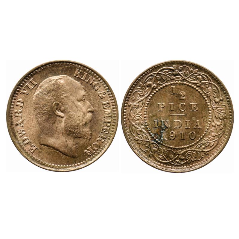 Edward VII, Bronze, 1/2 Pice, 1910, Calcutta Mint, No mint mark. GK 1011. Uncirculated Details. Very Scarce.