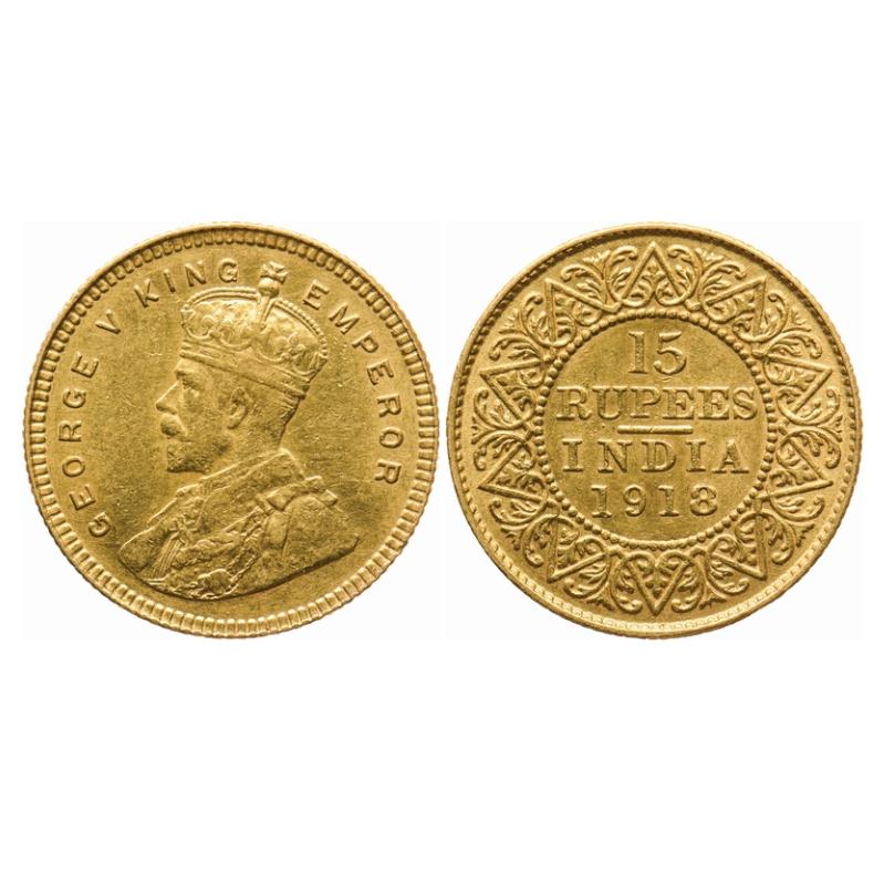 George V, Gold, 15 Rupees, 1918. B.M. in relief on the truncation of the shoulder. F.Prid. 25. Very Fine+. Rare.