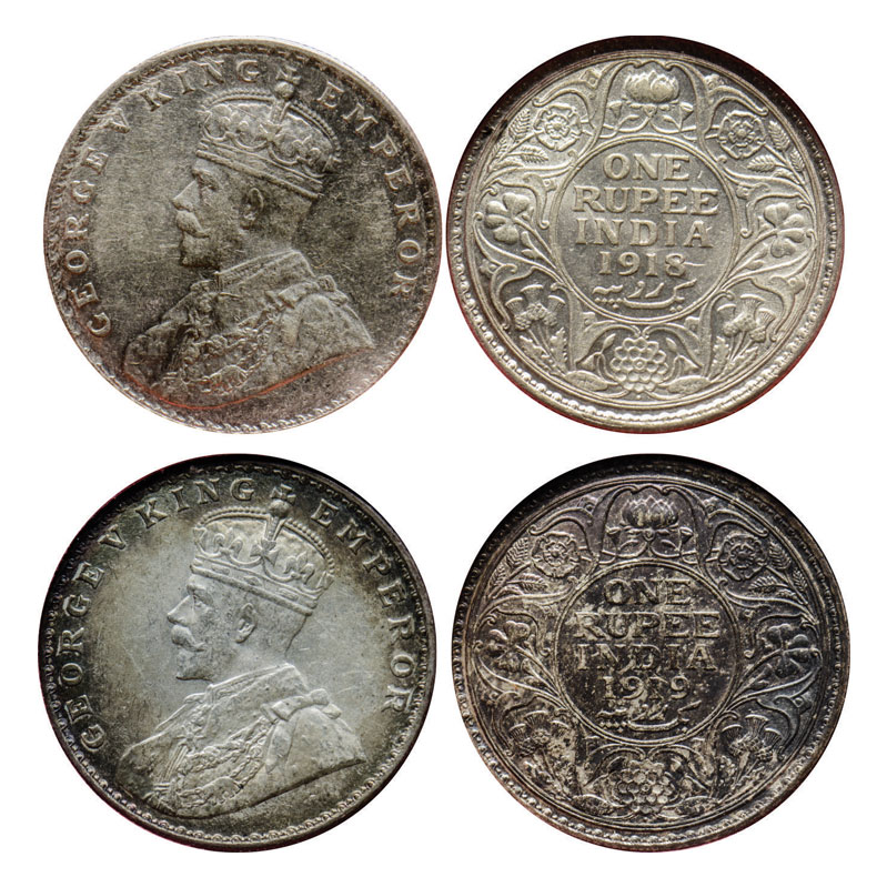 | George V, Silver, Rupee (2 coins), 1918, Bombay Mint, Dot, Ghost image on obv and rev, 1919, Bombay Mint, Dot. GK 1038, 1040. NGS Slabbed XF 45+, AMS 55 Toned. Scarce. |