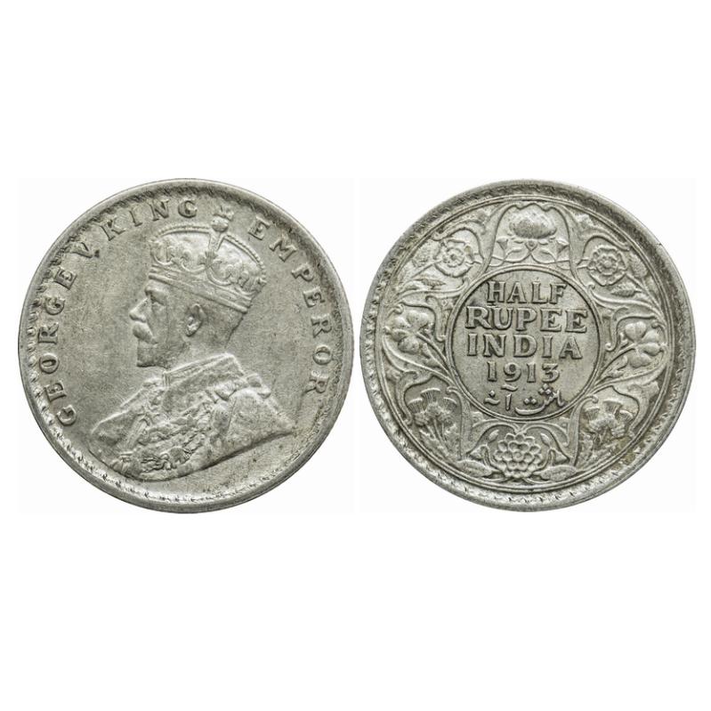 George V, Silver, Half Rupee, 1913, Calcutta Mint, No dot. GK 1048. Very Fine+. Very Scarce.