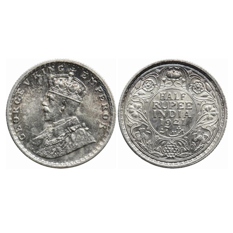 George V, Silver, Half Rupee, 1921, Calcutta Mint, No dot. GK 1058. Almost Uncirculated. Very Scarce.