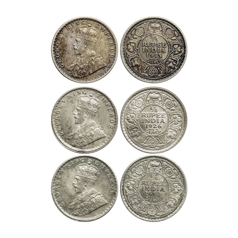| George V, Silver, 1/4 Rupee (3 coins), 1913, 1926, 1930, Calcutta Mint, No dot. GK 1083, 1094, 1097. Very Fine to Extremely Fine+. Scarce. |