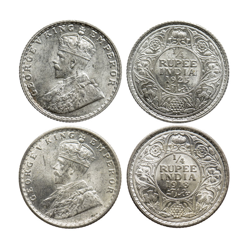 | George V, Silver, 1/4 Rupee (2 coins), 1918, Calcutta Mint, No dot, 1925, Bombay Mint, Dot. GK 1091, 1093. Brilliant Uncirculated. Very Scarce. |