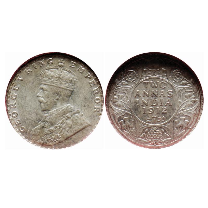 George V, Silver, 2 Annas, 1912, Bombay Mint, Dot. GK 1109. NGS Slabbed. MS 63. Rare.