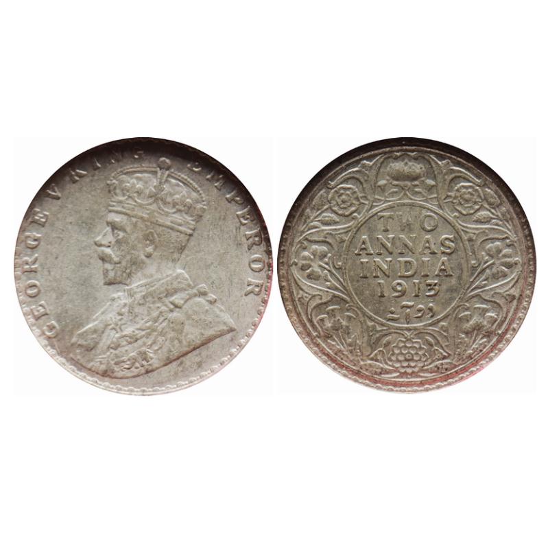 George V, Silver, 2 Annas (5 coins), 1912, 1913, 1914, Bombay Mint, Dot. 1916, 1917, Calcutta Mint,...