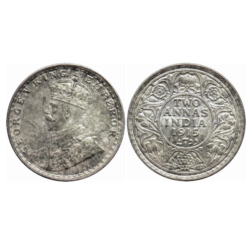 George V, Silver, 2 Anna, 1915, Bombay Mint, Dot, Ghost on obv. GK 1115. Uncirculated, Toned. Very Scarce.