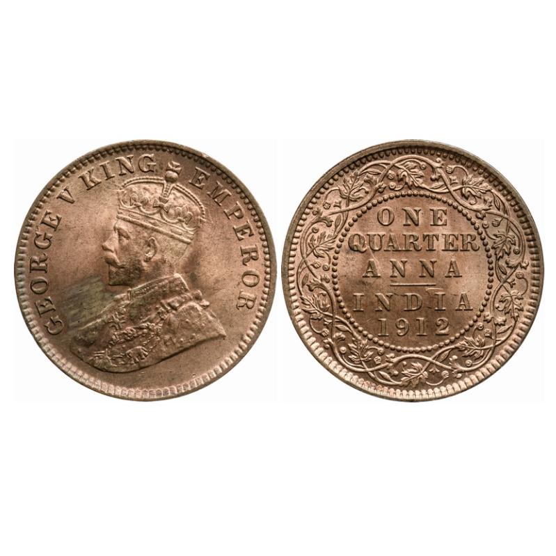 George V, Bronze, Quarter Anna, 1912, Calcutta Mint, No dot, Ghost on rev. GK 1172. Uncirculated. Scarce.