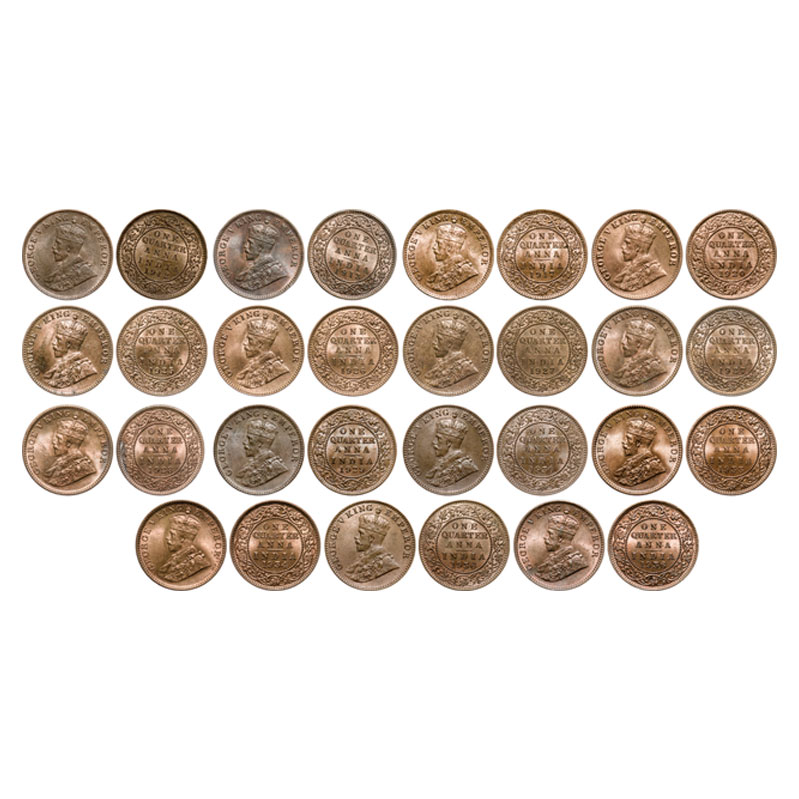 | George V, Bronze, Quarter Anna (15 coins), Calcutta Mint, 1912, 1913, 1917, 1920, 1927, 1928, 1929, 1933, 1934, 1936, Bombay mint, 1925, 1926, 1927, 1930, 1936. GK 1172, 1173, 1176, 1179, 1186, 1188, 1189, 1193, 1194, 1197, 1181, 1183, 1185, 1190, 1196. Uncirulated. Scarce. |