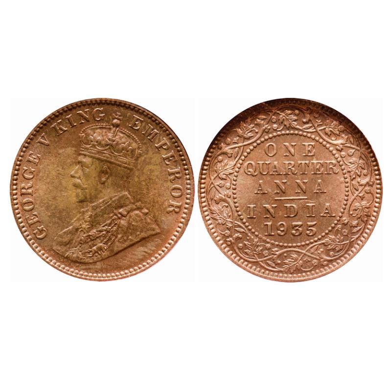 George V, Bronze, Quarter Anna, 1935, Calcutta Mint, No dot. GK 1195. NGS Slabbed. MS 63. Very Scarce.