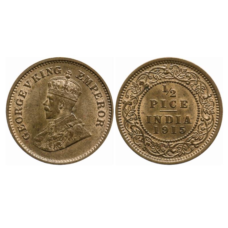 George V, Bronze, 1/2 Pice, 1915, Calcutta Mint, No mint mark. GK 1201. Uncirculated. Rare.