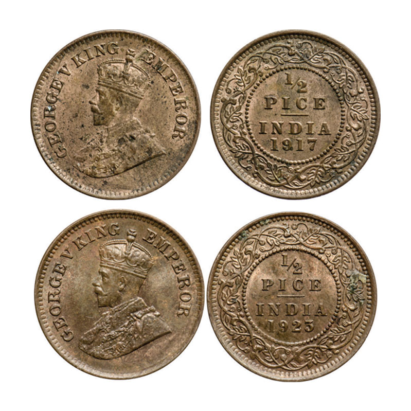 George V, Bronze, 1/2 Pice (2 coins), 1917, 1923, Calcutta Mint, No mint mark. GK 1203, 1209. About Uncirculated to Uncirculated Details. Very Scarce.