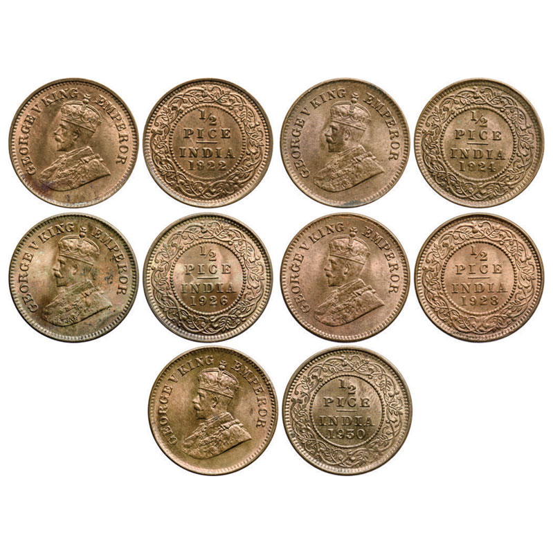 | George V, Bronze, 1/2 Pice (5 coins), 1922, 1924, 1926, 1928, 1930, Calcutta Mint, No mint mark. GK 1208, 1210, 1212, 1214, 1216. Uncirculated. Scarce as a lot. |