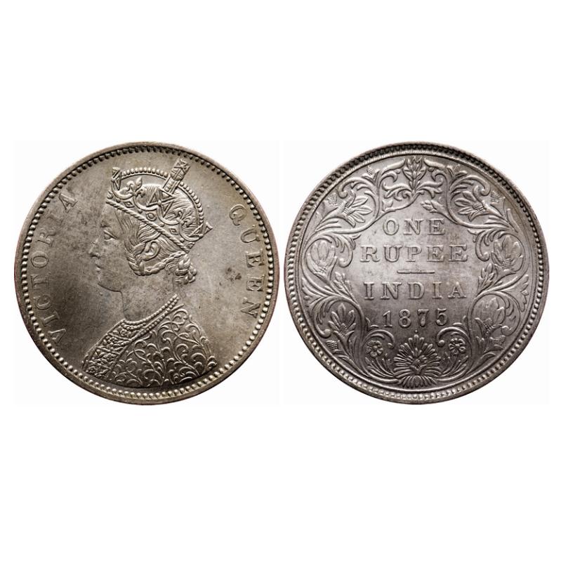 Victoria Queen, Silver, Rupee, 1875, Bombay Mint, A2/II/Dot, Top stroke of numeral 5 long. GK 424. NGS Slabbed AMS 58. Very Scarce.