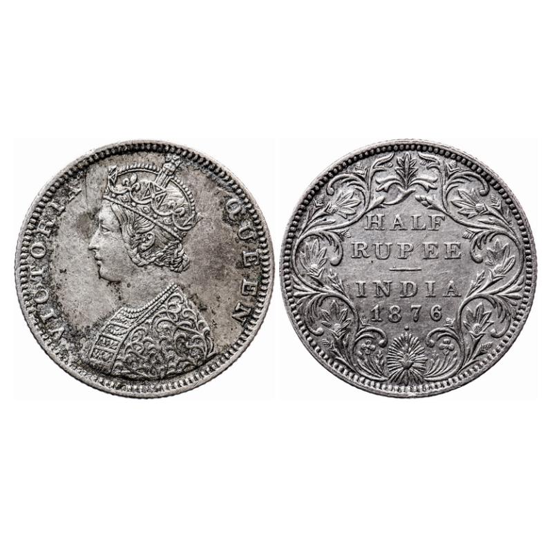 Victoria Queen, Silver, Half Rupee, 1876, Bombay Mint, B2/II, Dot, Queen's jabot has 4 1/4 panels. GK 606. Extremely Fine, Details. Very Scarce. |