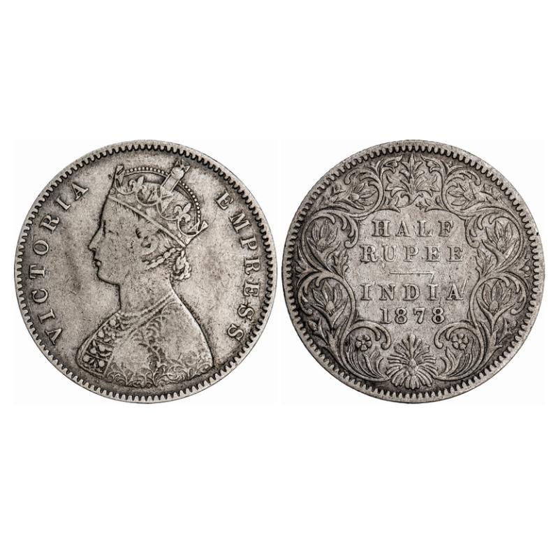 Victoria Empress, Silver, Half Rupee, 1878, Calcutta Mint, A/I, No mint mark. GK 612. About Very Fine. Scarce.