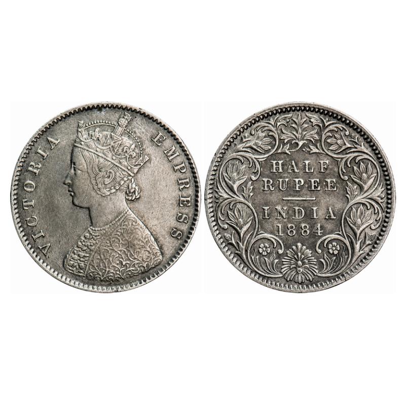 Victoria Empress, Silver, Half Rupee, 1884, Calcutta Mint, A/I, 'C' incused, Die doubling of alphabets in 'Victoria' 'Empress'. GK 628. Very Fine+, Rare. |