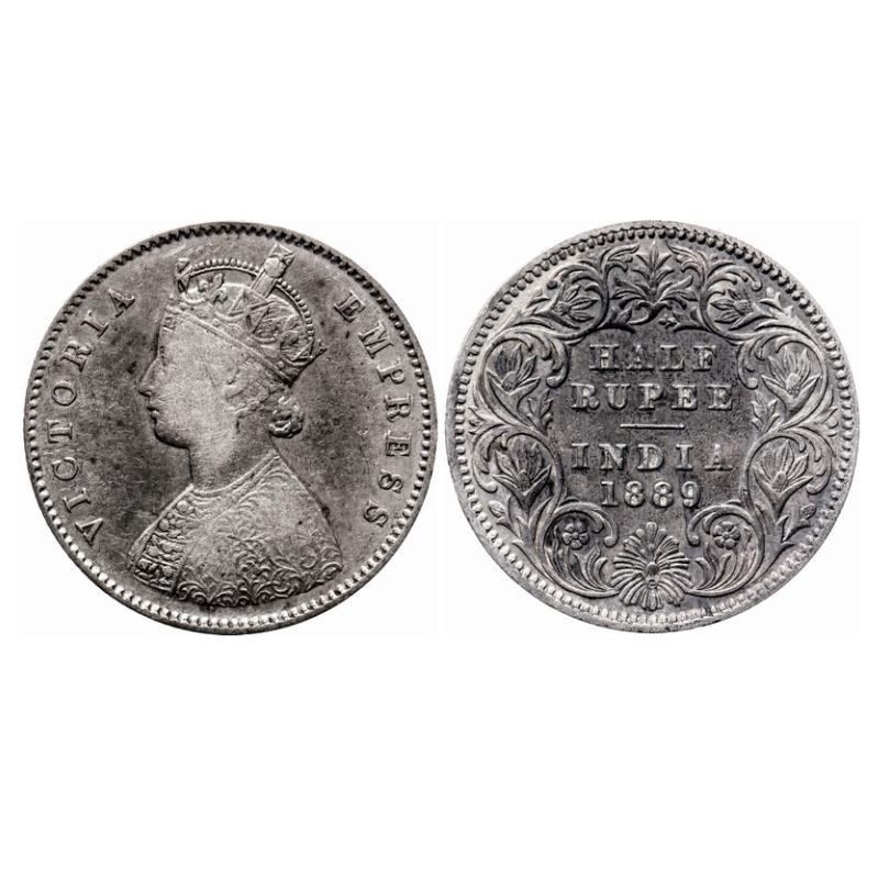 Victoria Empress, Silver, Half Rupee, 1889, Calcutta Mint, A/I, 'C' incused. GK 645. Very Fine+. Scarce.