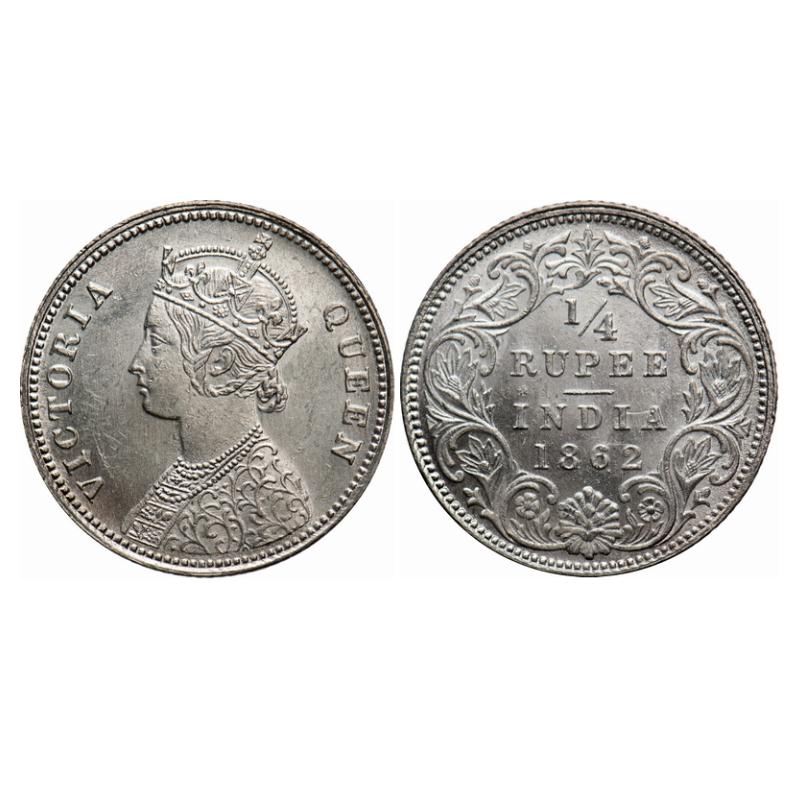 Victoria Queen, Silver, 1/4 Rupee, 1862, Calcutta Mint, A/I, Misaligned die on Obv, Ghost on Rev. GK 375. Brilliant Uncirculated. Rare.