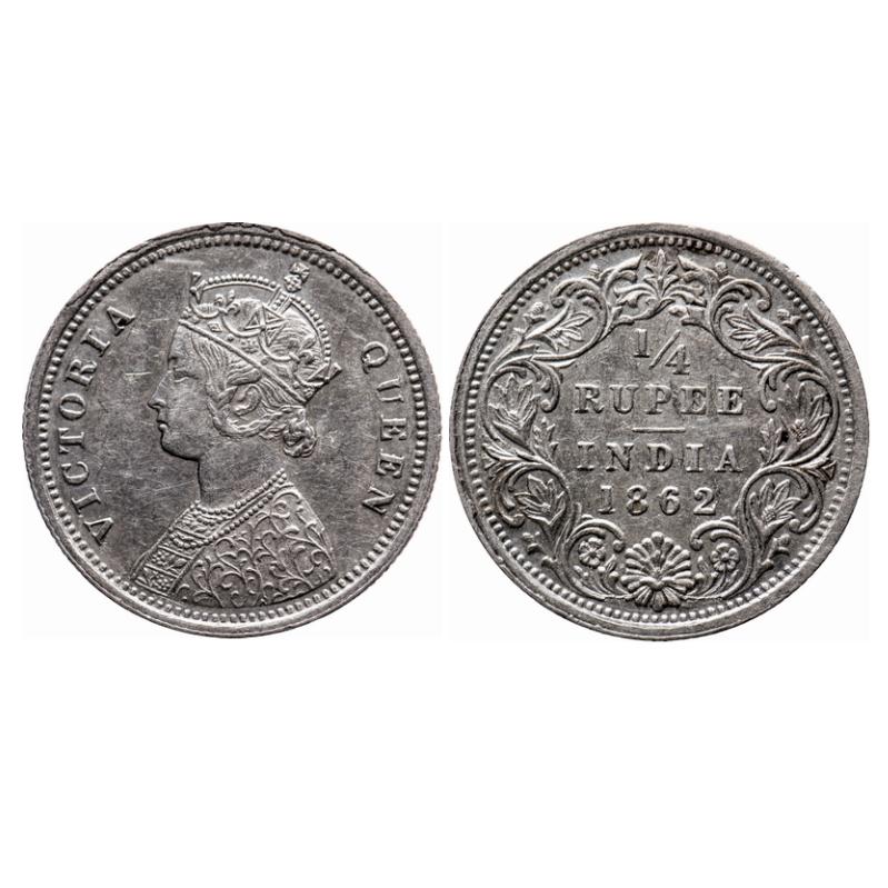 Victoria Queen, Silver, 1/4 Rupee, 1862, Bombay Mint, A/I, Cud's on Obv rim edge, Ghost on Obv, Misaligned die on rev, Die crack on Rev, Alphabet's 'U' 'E' and 'N' of Queen broken. GK 377. Extremely Fine+. Very Scarce. |