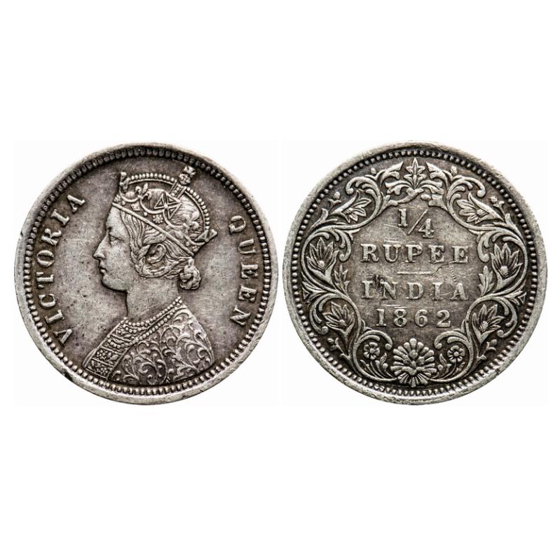 Victoria Queen, Silver, 1/4 Rupee, 1862, Calcutta Mint, A/I, Small 'V' inverted in the center of th...