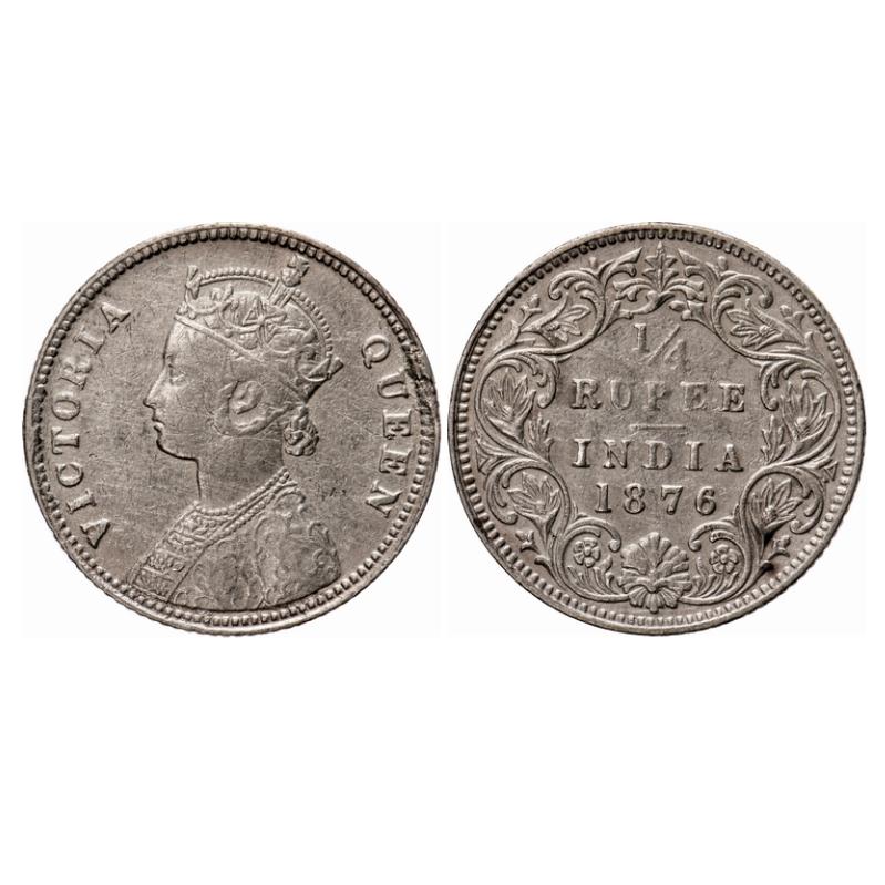 Victoria Queen, Silver, 1/4 Rupee, 1876, Calcutta Mint, A/I, No mint mark, No 'C', Ex-mount. GK 669. Very Fine, Cleaned. Scarce. |