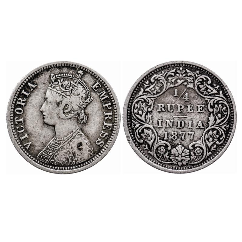 Victoria Empress, Silver, 1/4 Rupee, 1877, Bombay Mint, A/I, Dot, The Queen's jabot has 4 complete panels, The last panel has a design of 6 dotted flower to the right side, Inverted 'V' raised in the center. GK 670. Very Fine. Scarce. |