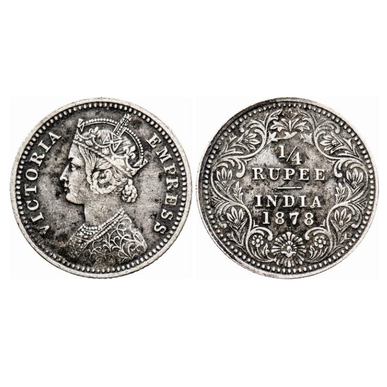 Victoria Empress, Silver, 1/4 Rupee, 1878, C/II, No mint mark, No 'C'. GK 673. Very Fine+, Details. Very Scarce.