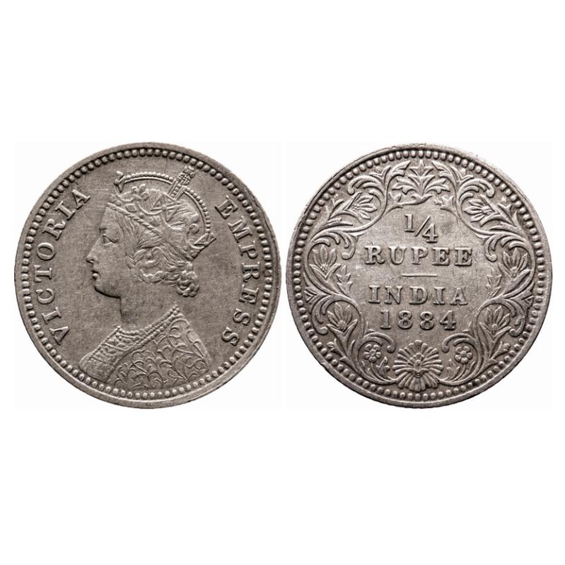 Victoria Empress, Silver, 1/4 Rupee, 1884, Calcutta Mint, C/II, No mint mark, No 'C', Ghost on Rev. GK 698. Very Fine+. Rare. |