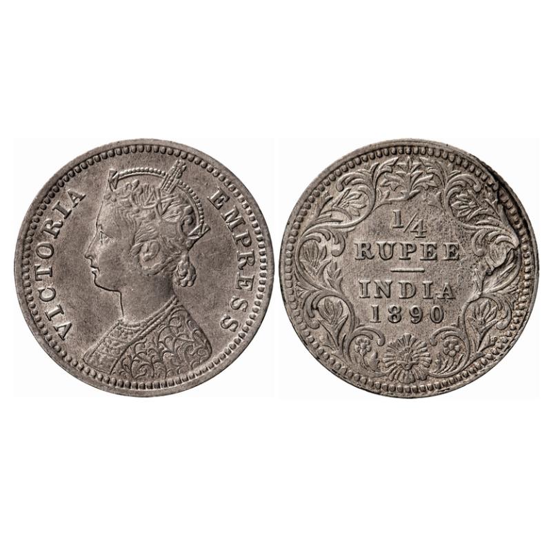 Victoria Empress, Silver, 1/4 Rupee, 1890, Calcutta Mint, C/II, 'C' incused, Ghost on Rev, Planchet flaw on Rev. GK 719. Extremely Fine. Scarce. |