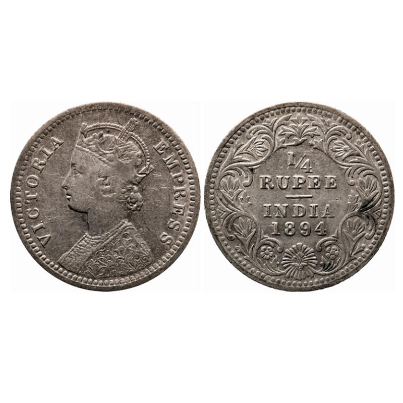 Victoria Empress, Silver, 1/4 Rupee, 1894, Calcutta Mint, C/II, 'C' incused. GK 727. Very Fine, Cleaned. Scarce.