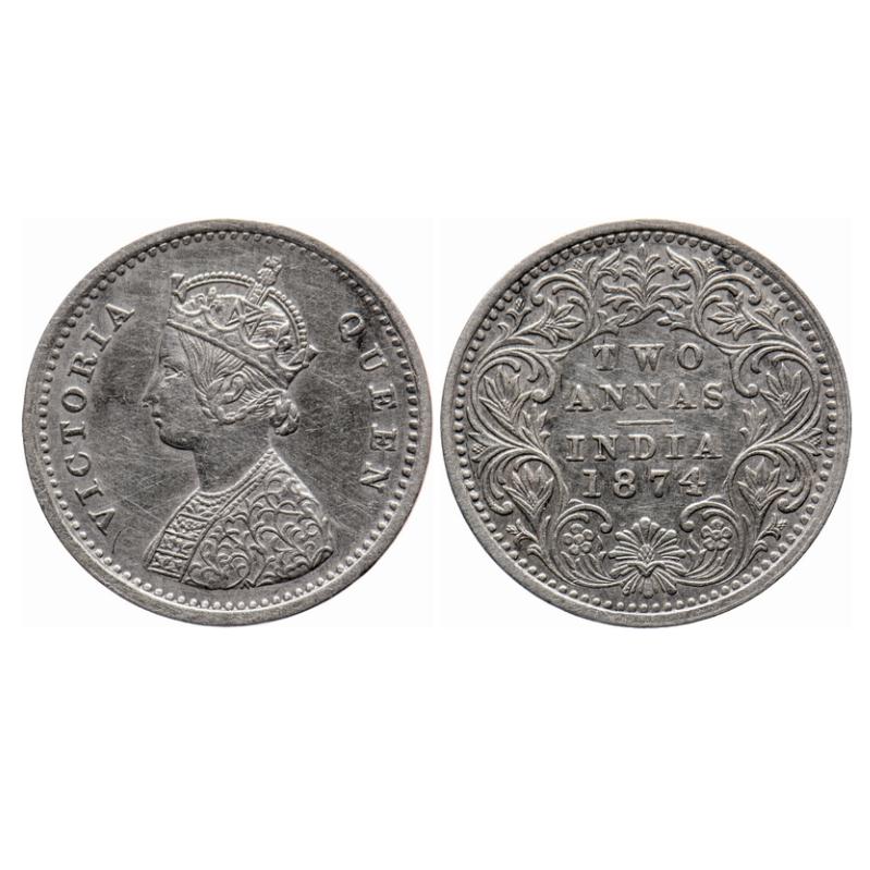 Victoria Queen, Silver, 2 Annas, 1874, Bombay Mint, A/I, No mint mark, No dot, Extra metal on eye lid and nose, Broken numeral 4. GK 738. About Uncirculated. Rare. |