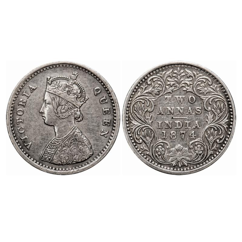 Victoria Queen, Silver, 2 Annas, 1874, Bombay Mint, A/I, No mint mark, No dot, Extra metal on eye l...