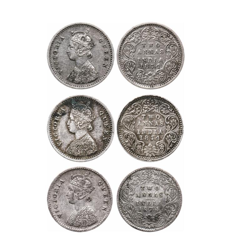 Victoria Queen, Silver, 2 Annas (3 Coins), 1874, Bombay Mint (2 coins), A/I, No mint mark, No dot, Calcutta Mint, A/I, No mint mark. GK 738, 740. Very Fine+ to Extremely Fine. Scarce. |