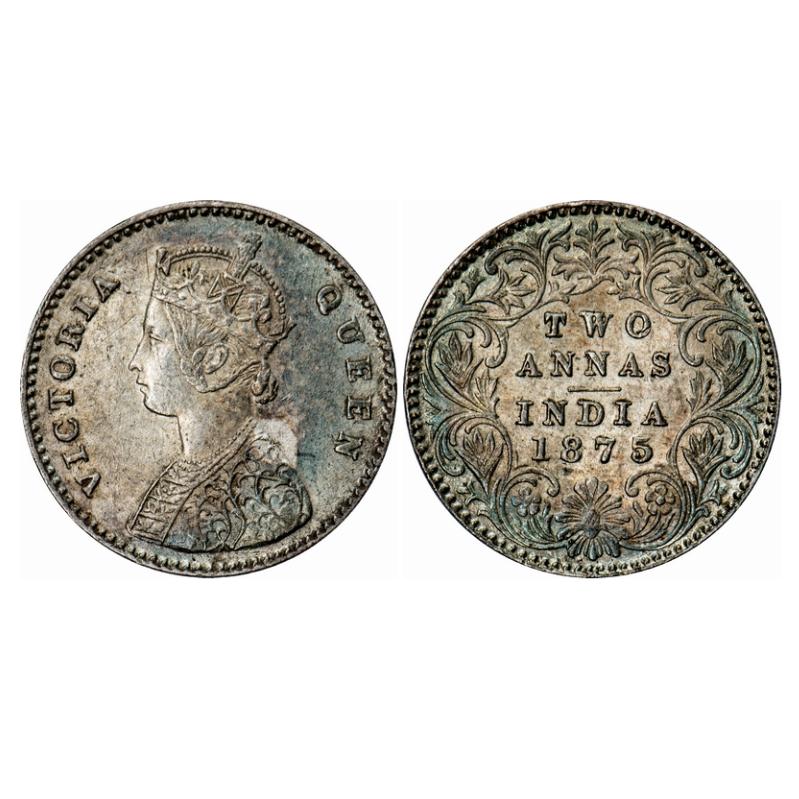 Victoria Queen, Silver, 2 Annas, 1875, Calcutta Mint, A/I, No mint mark. GK 742. Extremely Fine+. Very Scarce.