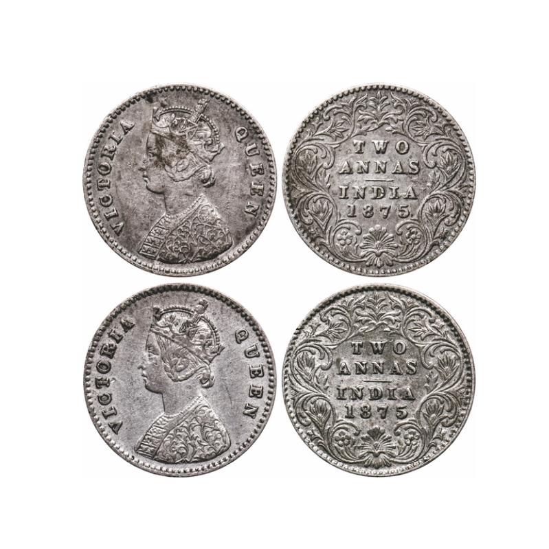 Victoria Queen, Silver, 2 Annas (2 Coins), 1875, Calcutta Mint, A/I, No mint mark. GK 742. Very Fine to Very fine+. Scarce.