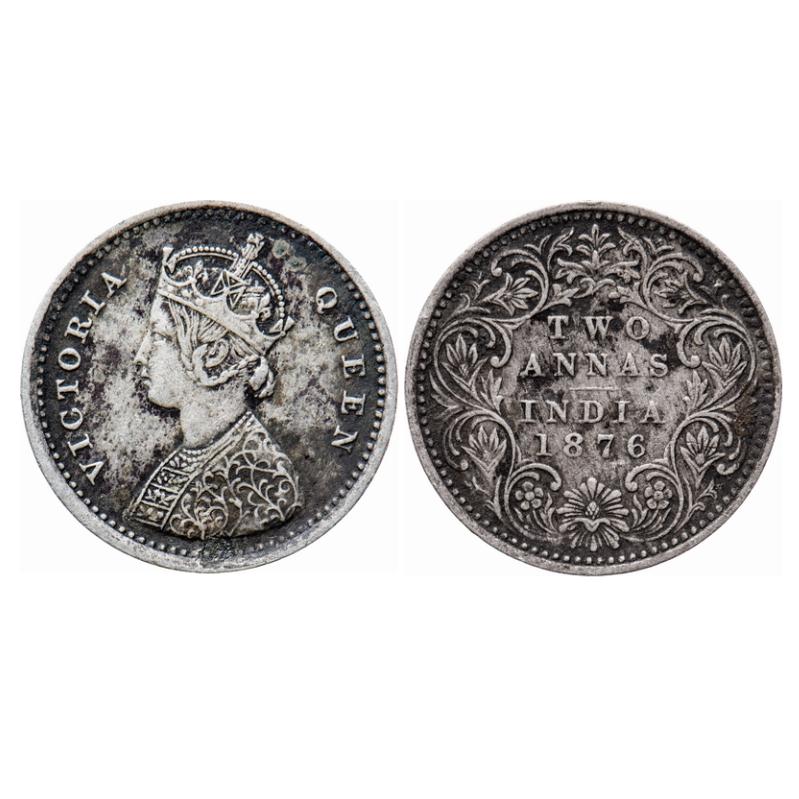 Victoria Queen, Silver, 2 Annas, 1876, Bombay Mint, A/I, No mint mark, No dot. GK 743. Very Fine. Scarce.