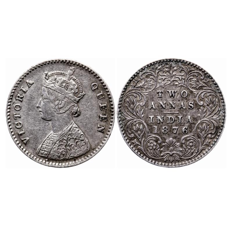 Victoria Queen, Silver, 2 Annas, 1876, Calcutta Mint, A/I, No mint mark. GK 745. Very Fine+. Scarce.