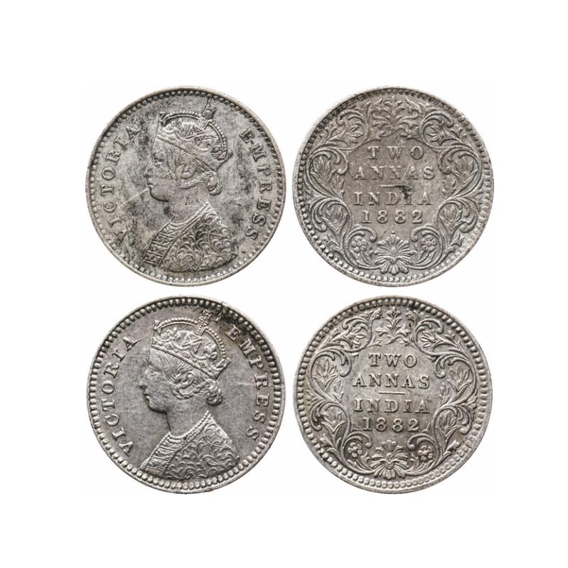 Victoria Empress, Silver, 2 Annas (2 Coins), 1882, Bombay Mint, A/I, Dot, Calcutta Mint, B/II, 'C' incused. GK 759, 763. Very Fine to Very Fine+. Scarce. |
