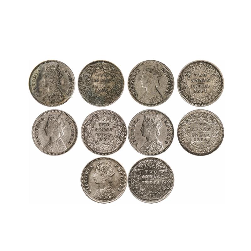 Victoria Empress, Silver, 2 Annas (5 Coins), 1883, Bombay Mint, A/I, Dot, 1891, Bombay Mint, B/II, 'B' incused, 1893, Calcutta Mint, B/II, 'C' incused, 1896, Bombay Mint, B/II, 'B' incused, 1897, Bombay Mint, B/II, 'B' incused. GK 765, 794, 800, 804, 806. Very Fine+, Details to Extremely Fine+. Scarces as a lot. |