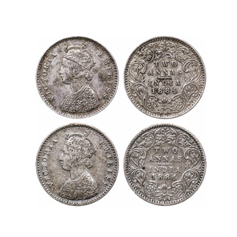 Victoria Empress, Silver, 2 Annas (2 Coins), 1884, Bombay Mint, 1) A/I, No dot, 2) A/I, 'B' raised. GK 769, 771. Very Fine to Very Fine+. Scarce. |
