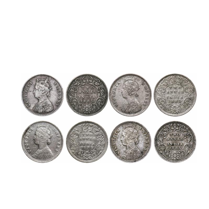 Victoria Empress, Silver, 2 Annas (4 Coins), 1885, Bombay Mint (2 coins), A/I, 'B' raised, Calcutta Mint (2 Coins), B/II, 'C' incused. GK 777, 779. Very Fine to Very Fine+. Scarce. |